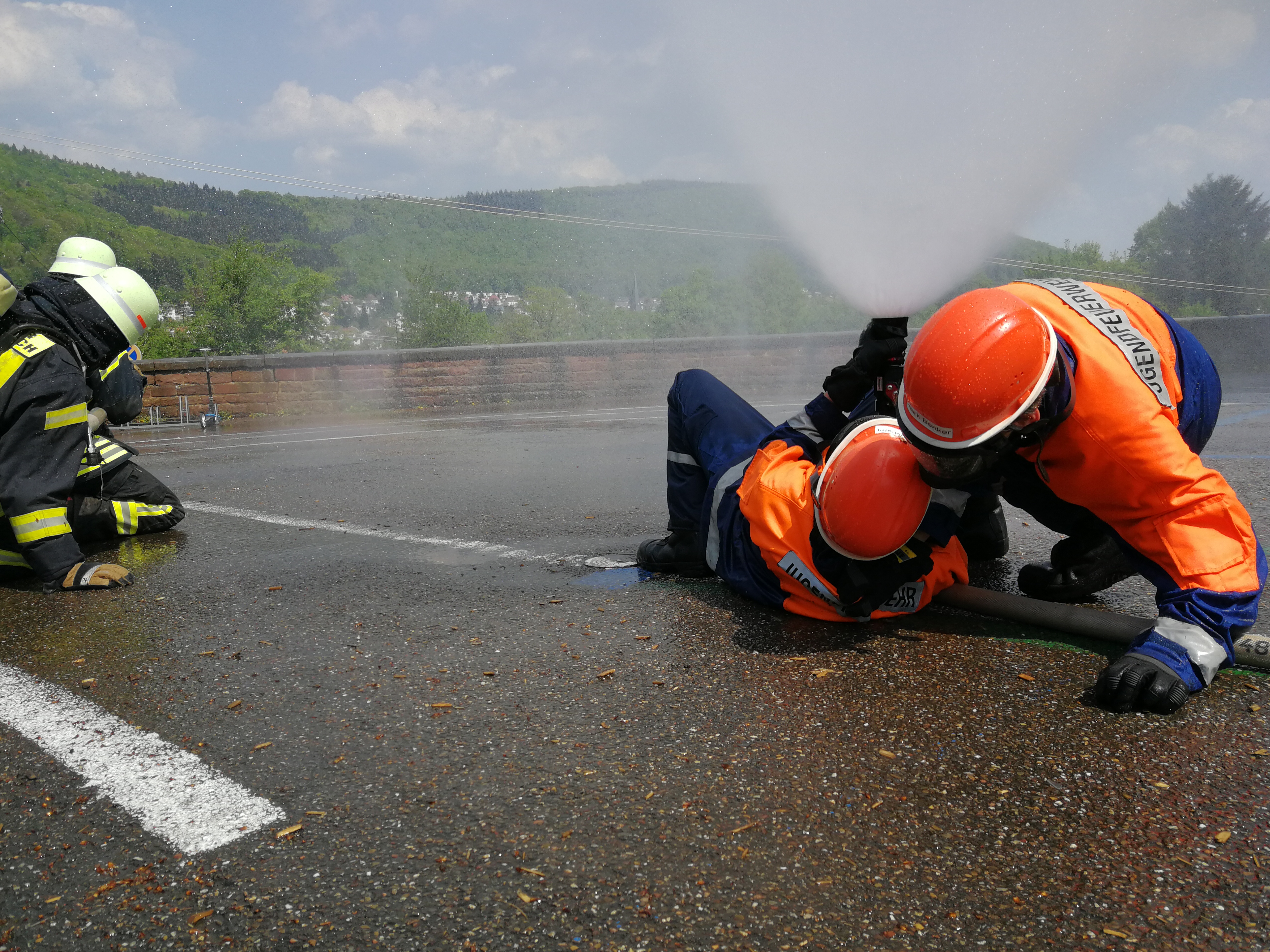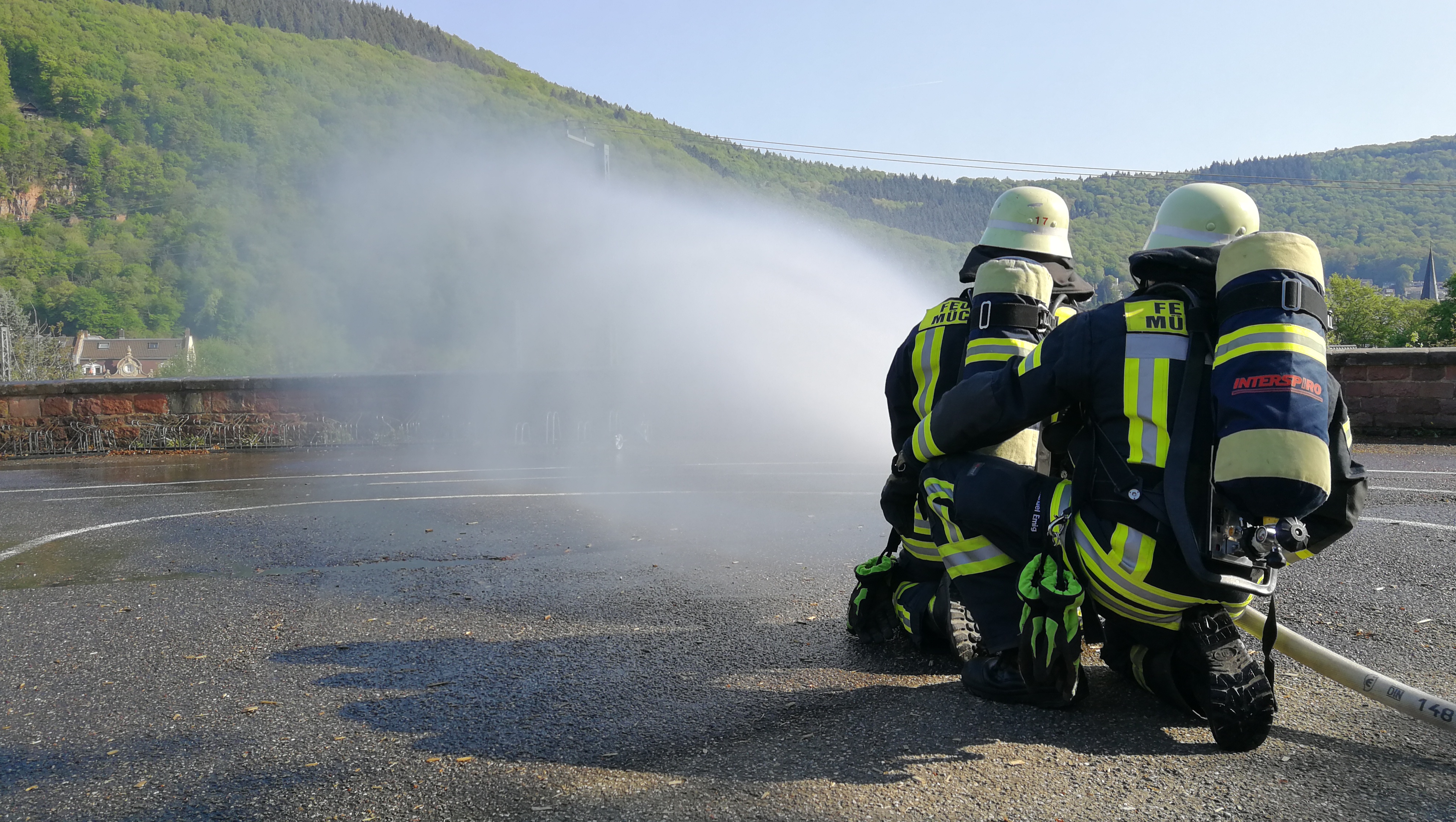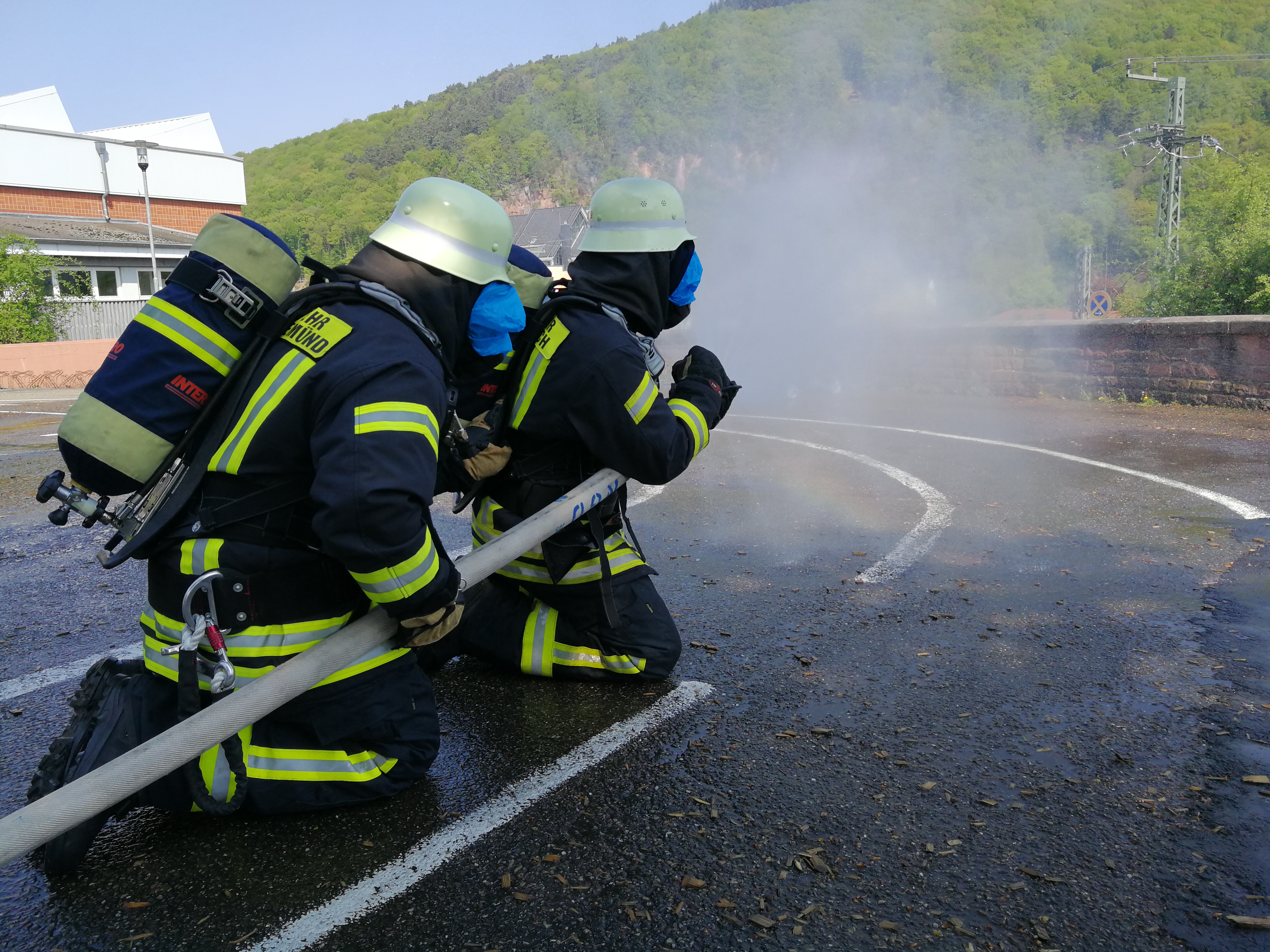 Beim Strahlrohrtraining sollten sich dich Teilnehmer mit den Hohlstrahlrohren vertraut machen, die verschiedenen Einstellungen studieren und sich Hilfsmittel am Strahlrohr einprägen, um dieses ohne Sichtkontakt bedienen zu können. Anschließend wurden die Masken der Atemschutzträger abgedunkelt und das gelernte „blinde Bedienen“ konnte unter Beweis gestellt werden.