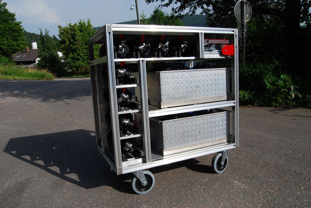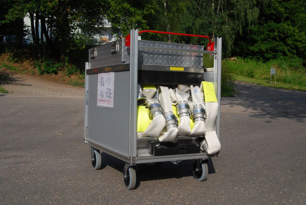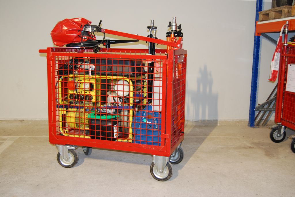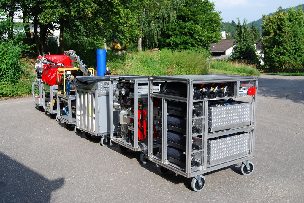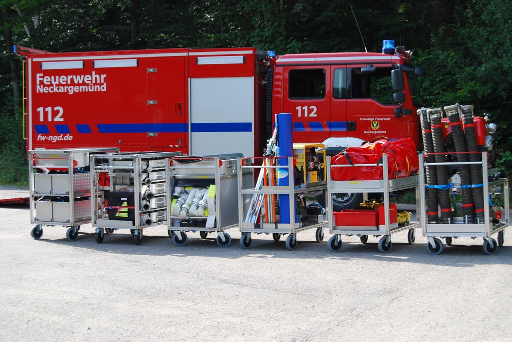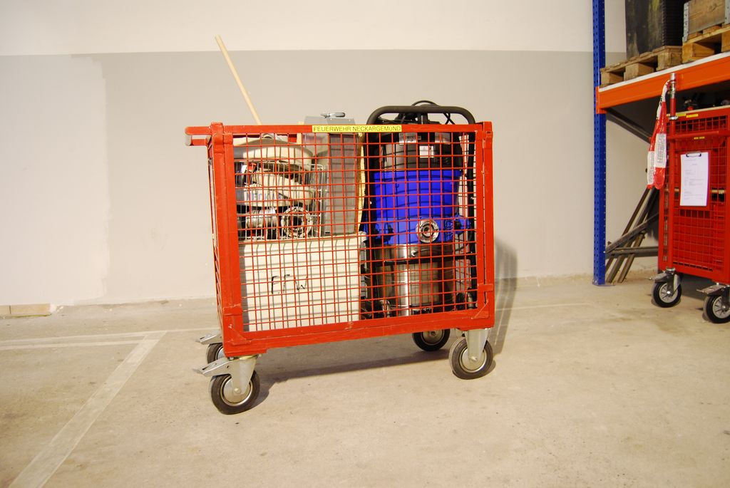 Nun galt es, entsprechende Rollcontainer zu beschaffen, um die im Gerätehaus gelagerten Geräte und Ausrüstungsgegenstände schnell und mit wenig Personal an die Einsatzstelle zu bekommen. Da die bekannten Hersteller solcher Containersysteme einen sehr hohen Preis verlangten und außerdem diese Systeme größenmäßig nicht passten, musste eine andere Lösung her.