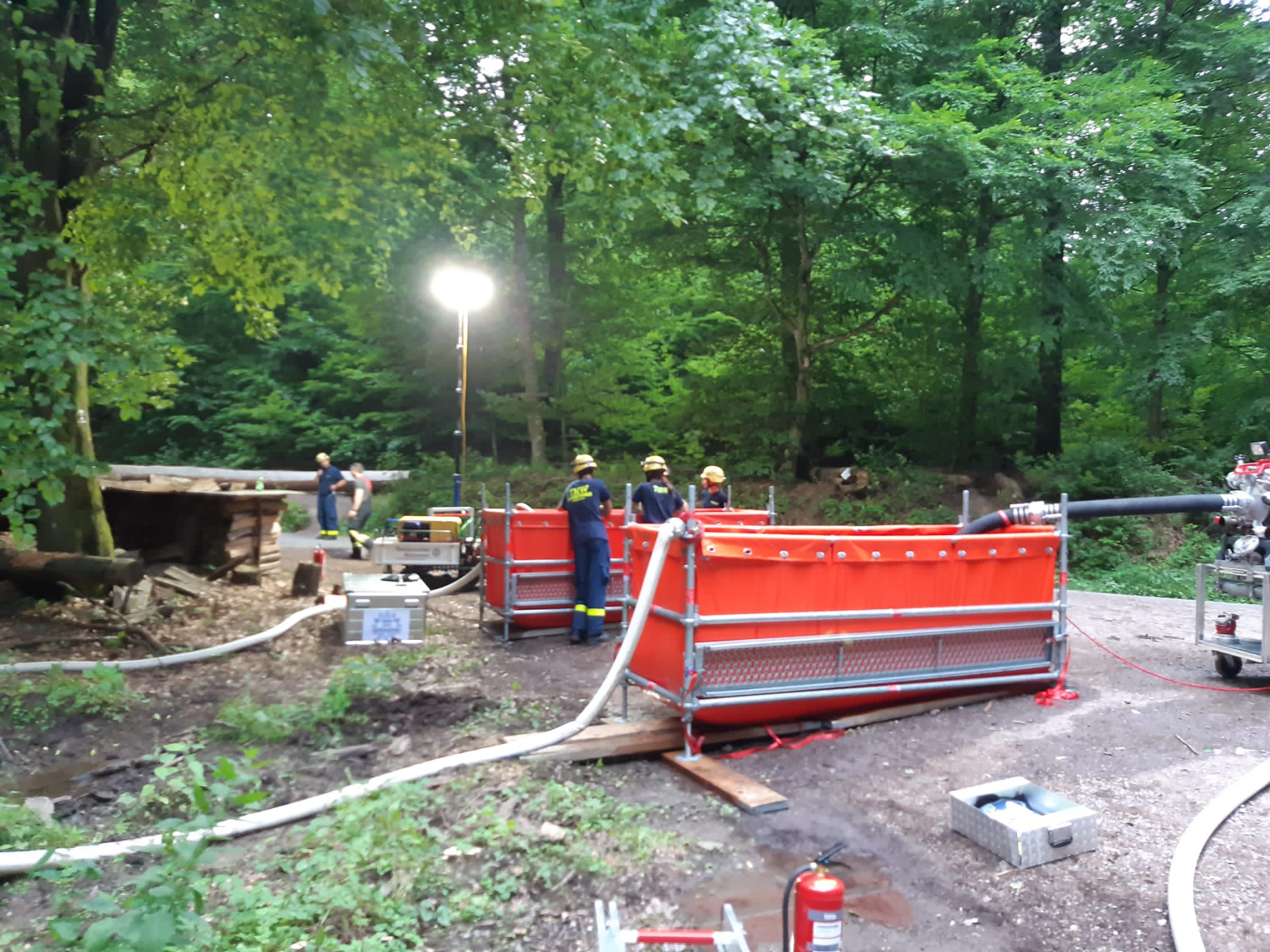 Zweiter Teil des Abends war es, gemeinsam mit dem THW Ortsverband Neckargemünd eine Wasserförderstrecke zur Neckarriedkopfhütte aufzubauen. So wurde durch die THW-Helfer ein Wasserübergabepunkt mittels EGS (Einsatzgerüstsystem) aufgebaut und entsprechend mit Wasser gefüllt. Einsatzkräfte der Feuerwehr bauten eine Schlauchleitung mit Entnahme- und Verstärkerpumpe auf und förderten so das Löschwasser bis zur Neckarriedkopfhütte.