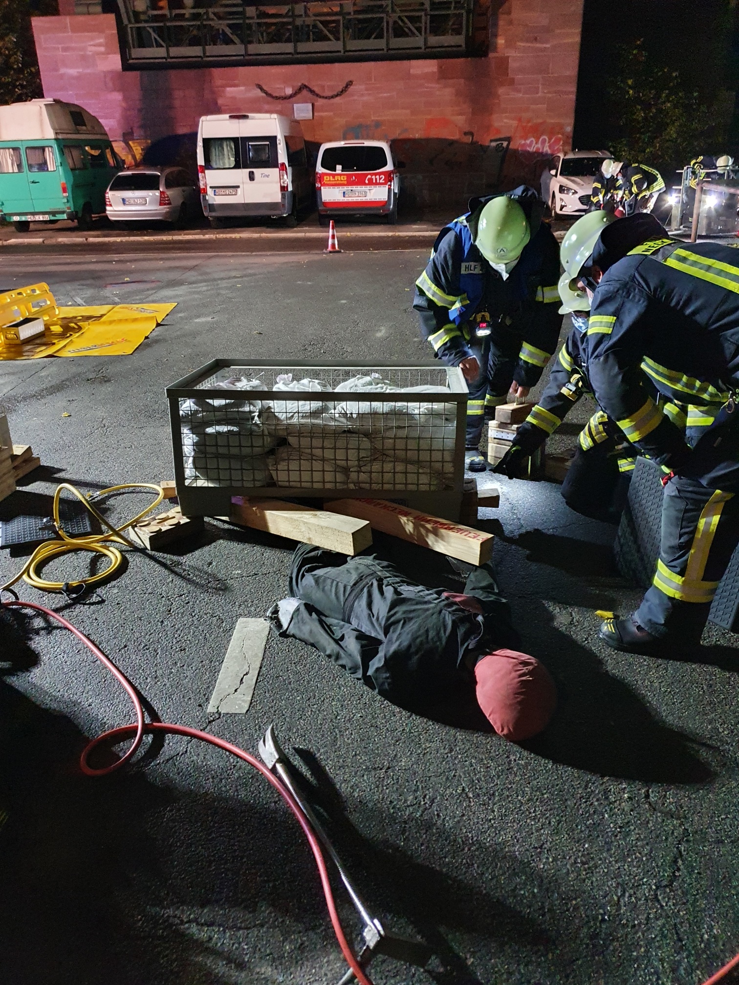Mehrere Trupps waren für die Absperrung und die ausreichende Beleuchtung der Einsatzstelle verantwortlich. Der verletzte Arbeiter, welcher in seinem Sicherungsgurt hing, wurde durch den Angriffstrupp der Drehleiter gerettet und an den Rettungsdienst übergeben. Der verletzte Passant wurde durch den Angrifftstrupp und Wassertrupp des Hilfeleistungslöschgruppenfahrzeugs mit Hilfe von hydraulischem Rettungsgerät von den Teilen der Arbeitsbühne befreit und an den Rettungsdienst übergeben. Die Arbeiterin erlitt durch den Schock einen Herz-Kreislauf-Stillstand. Sie konnte durch sofort eingeleitete Erste-Hilfe-Maßnahmen sowie eine Reanimation gerettet werden.