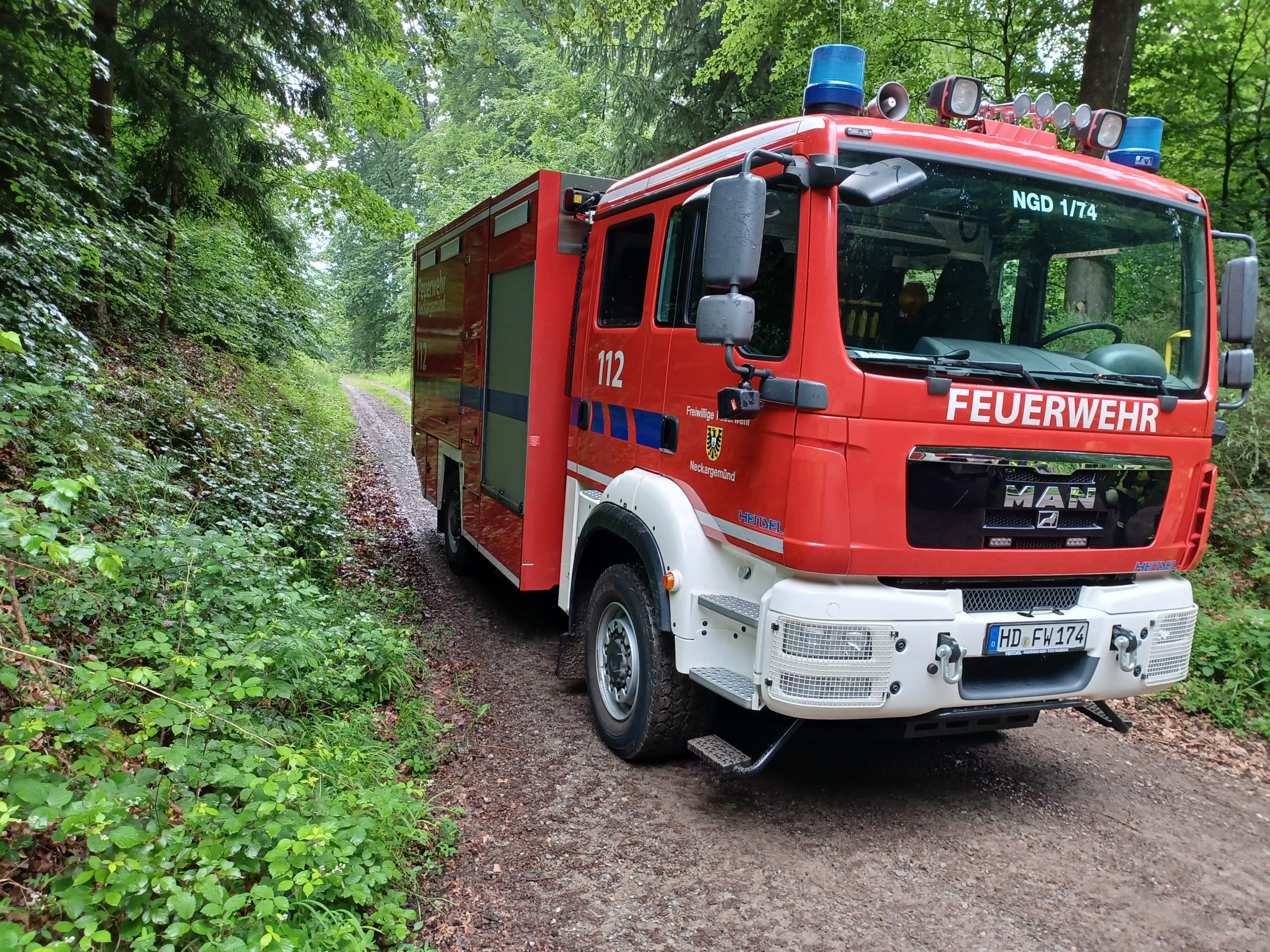 Hierzu begab man sich in den Wald auf der Gemarkung, unterhalb der Neckarriedkopfhütte. Für die Übung wurde die Einsatzmannschaft in zwei Teilgruppen unterteilt. In den Gruppen schaute man sich die eigens für die Wald- und Vegetationsbrandbekämpfung beschafften Werkzeuge und Gerätschaften genauer an. Die offiziellen Bezeichnungen der Spezialwerkzeuge führten in der Mannschaft teilweise zur Erheiterung. Damit auch der praktische Umgang geübt werden konnte, schlug man eine kleine Schneise in den Wald. Im Einsatzfall sollen derartige Schneisen eine Ausbreitung des Waldbrands verhindern. Zudem beschäftigte man sich nicht nur mit den Handwerkzeugen, sondern ebenfalls mit den Fahrzeugen als Ganzes und deren Pumpen. Im “Pump and Roll” ist es möglich, das Fahrzeug während des Pumpenbetriebs zu bewegen. Dies ermöglicht das Löschen in Bewegung entlang einer Feuerfront.