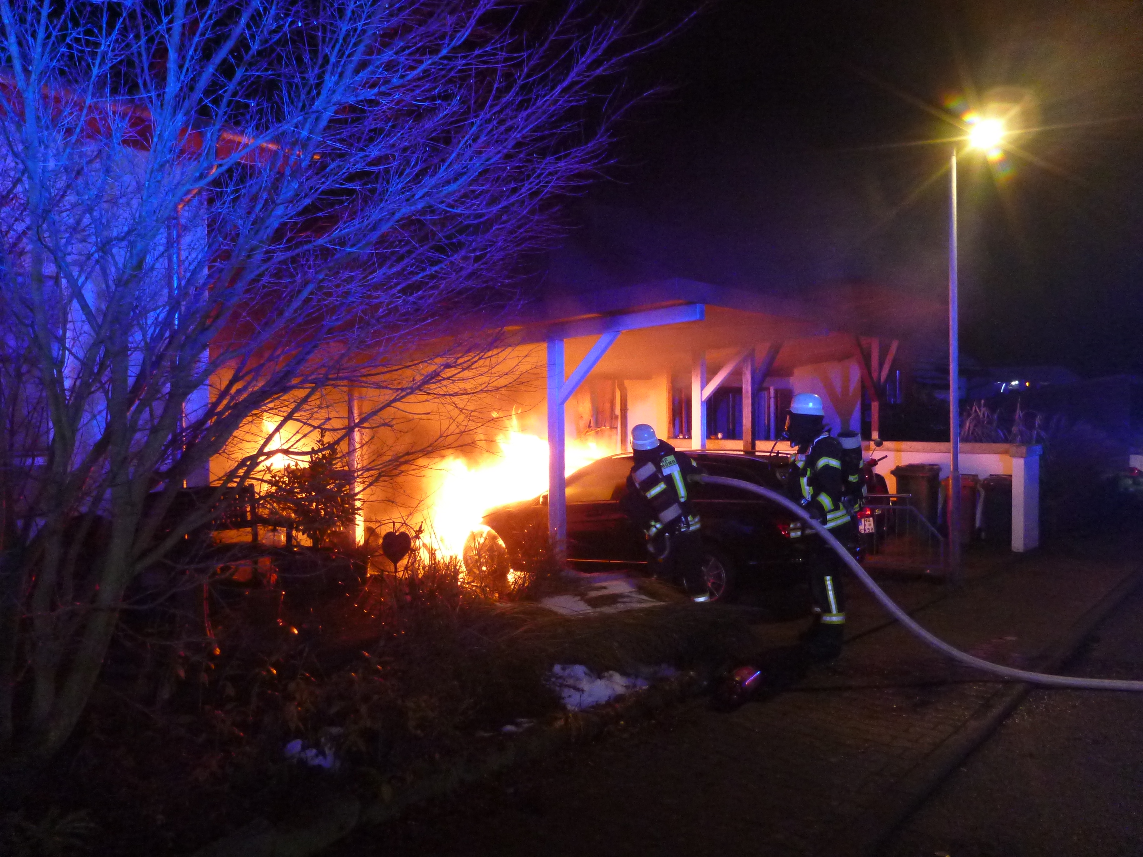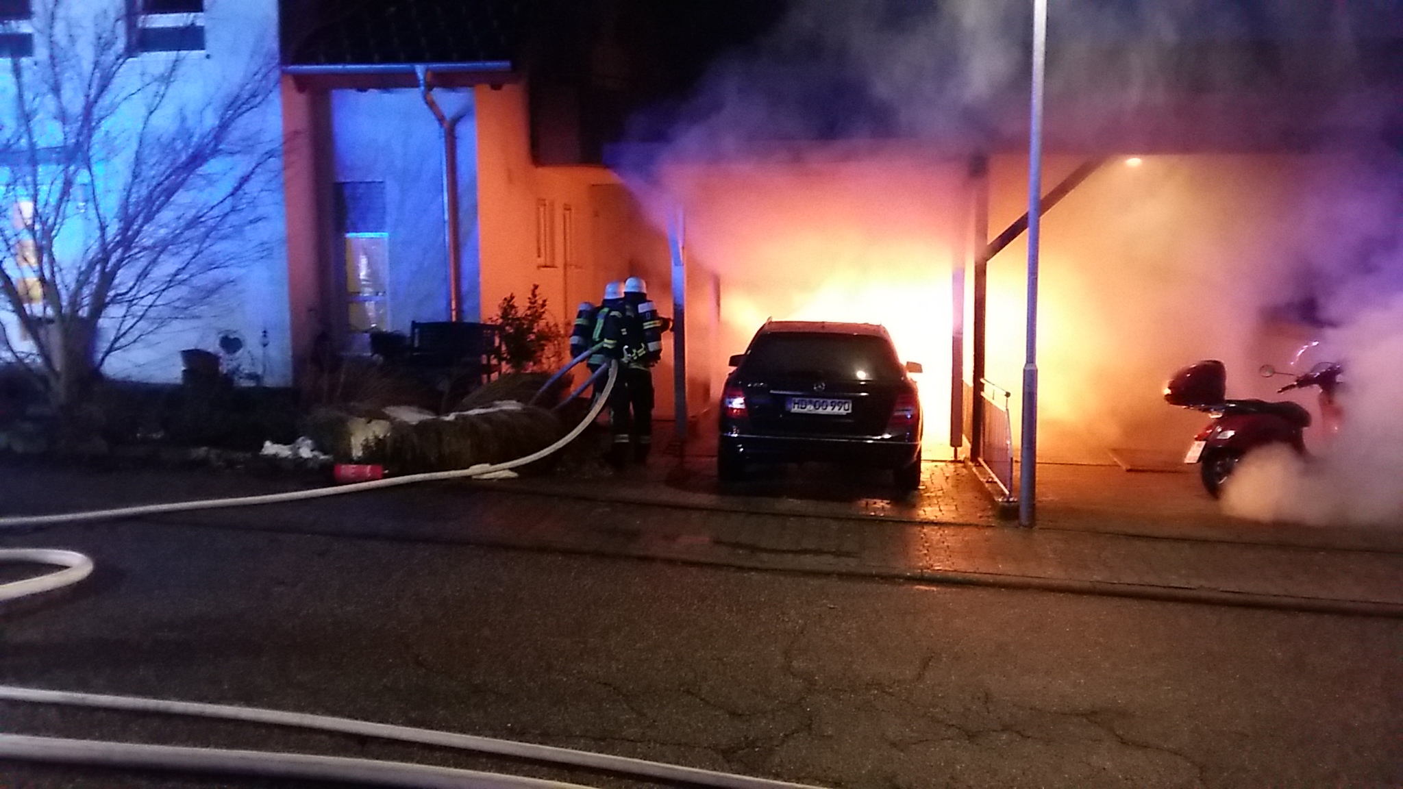 Beim Eintreffen der Einsatzkräfte brannte ein PKW sowie weitere Gegenstände unter einem Carport. Mit zwei C-Rohren wurde die Brandbekämpfung unter Atemschutz eingeleitet. Durch das schnelle Eingreifen der Feuerwehr konnte eine Brandausbreitung auf das Wohnhaus und ein angrenzendes Carport verhindert werden. Nach der Brandbekämpfung wurde die Einsatzstelle mittels Wärmebildkamera auf letzte Glutnester abgesucht und anschließend die Einsatzstelle an die Polizei zu weiteren Ermittlungen übergeben.