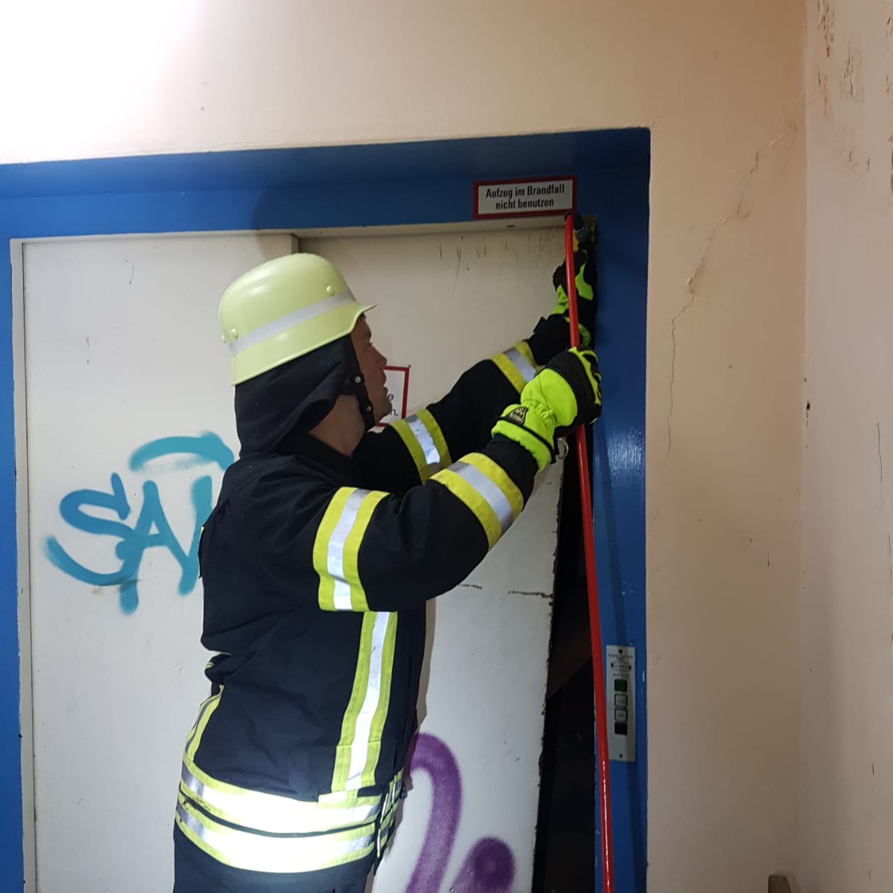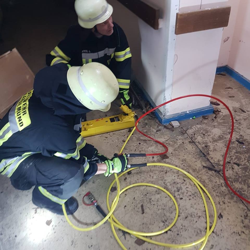 Da die Notentriegelung der Aufzugstür nicht mehr funktionierte und reine Hebelkraft nicht ausreichte, musste schweres Gerät eingesetzt werden. Mittels hydraulischem Hebesatz wurde die Türe so weit geöffnet, dass der Hund mit einer Leine an seinem Geschirr gesichert werden konnte. Anschließend wurde die Tür soweit aufgedrückt, dass der Hund in Sicherheit gebracht werden konnte.