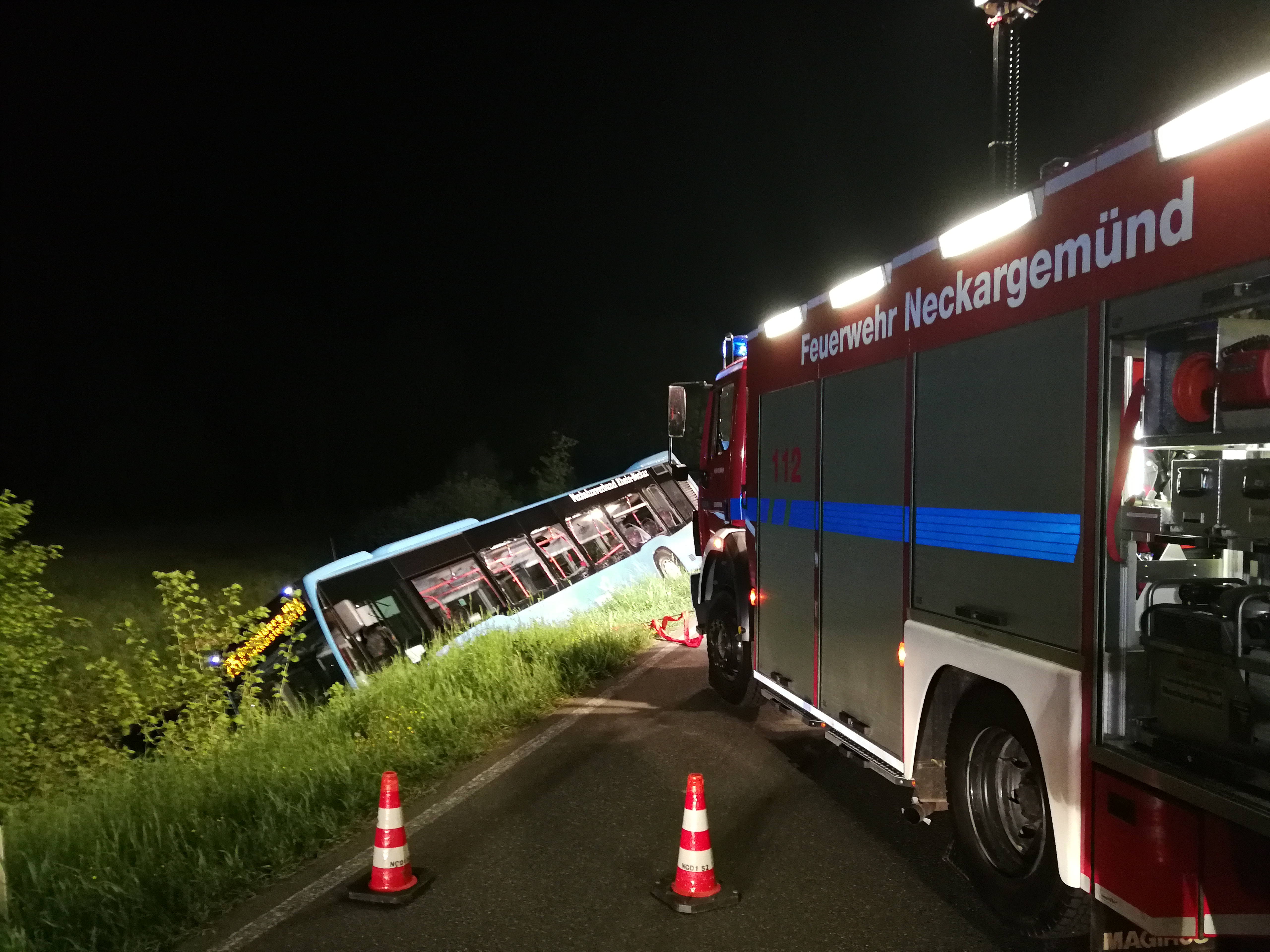Ein Linienbus war aus bisher unbekannter Ursache von der Fahrbahn der L535 abgekommen. Wir unterstützten vor Ort die Kameraden der Feuerwehren aus Schönau und Neckarsteinach bei der Sicherung des Buses.