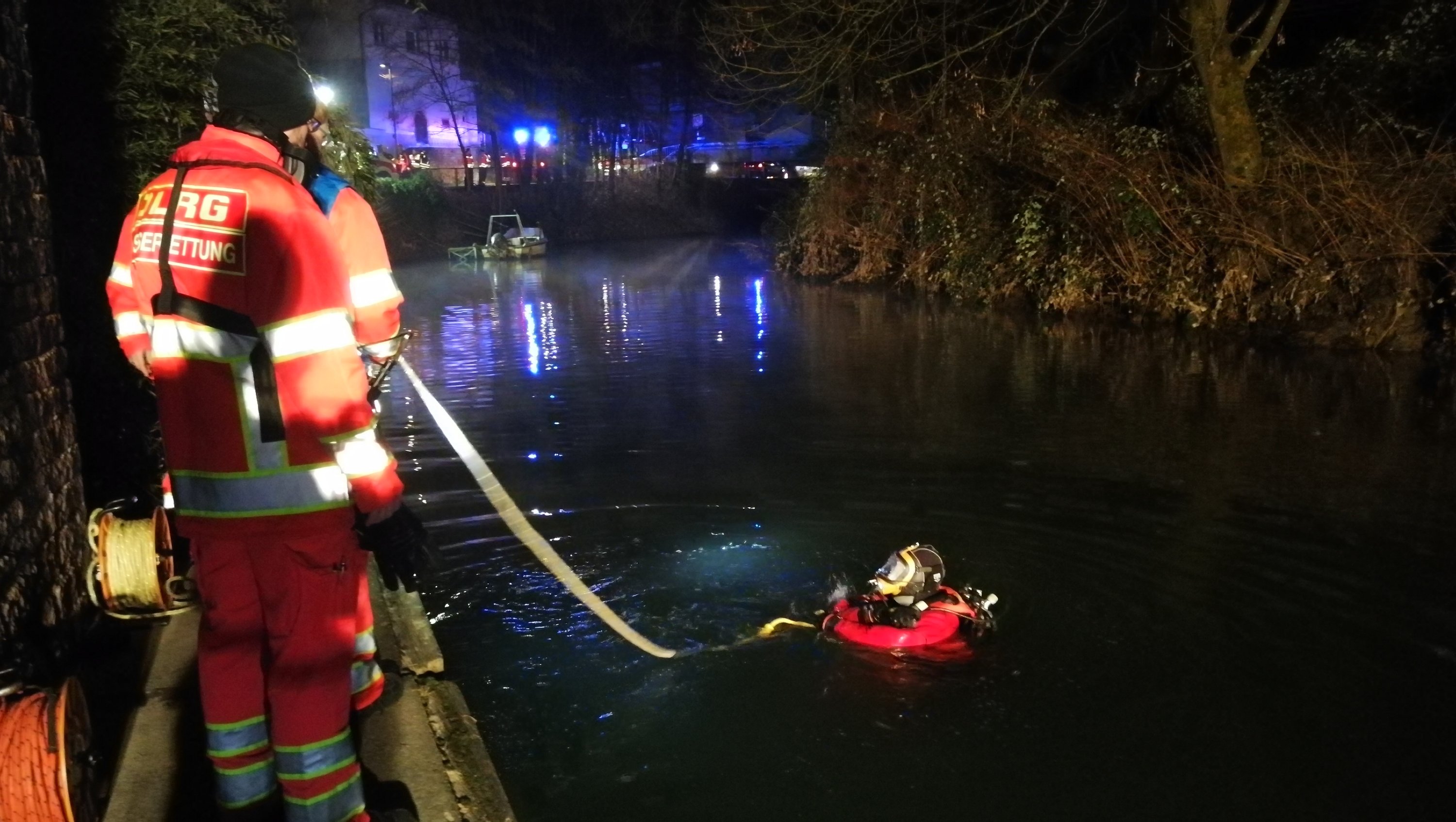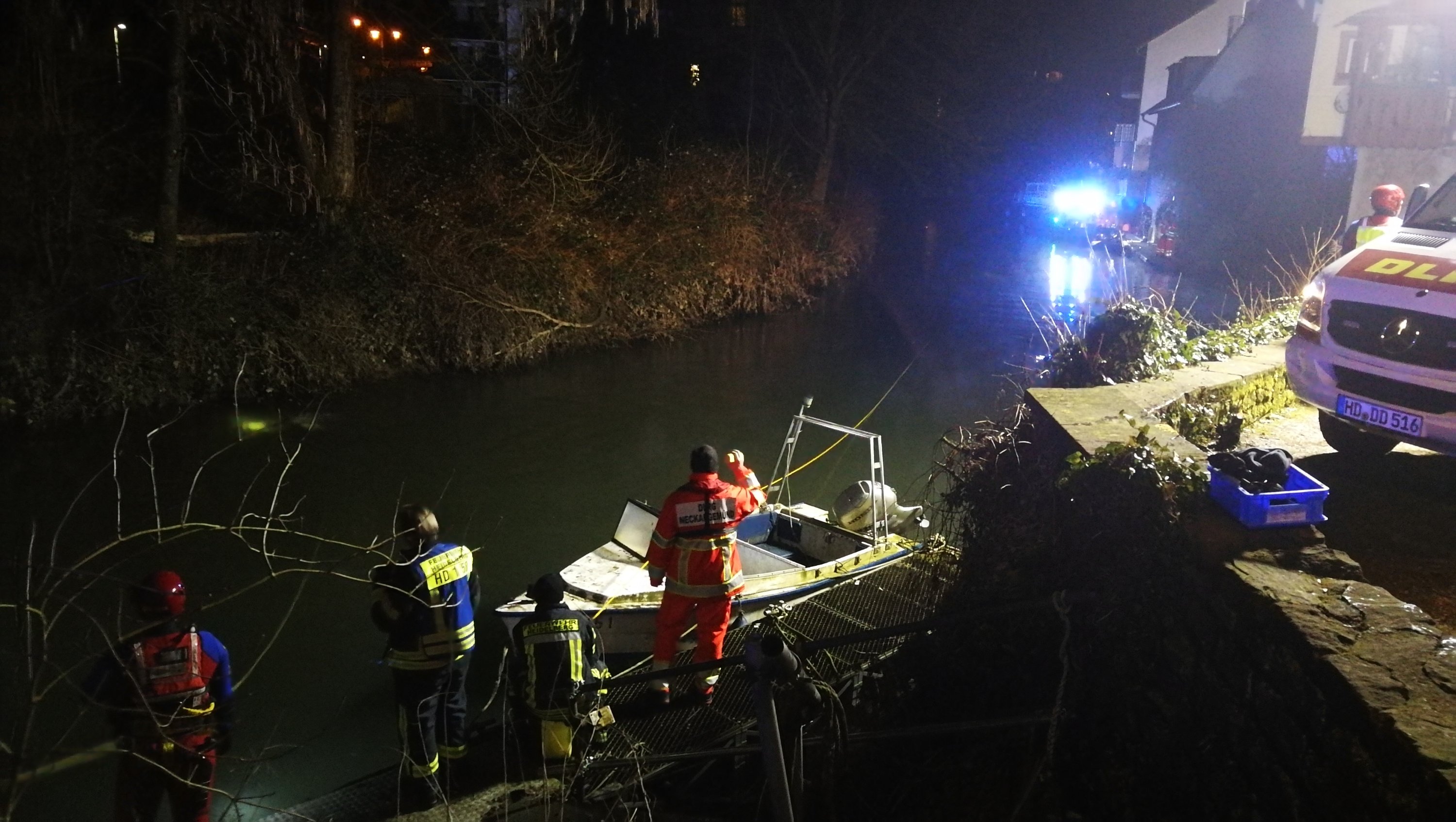 Taucher der Berufsfeuerwehr Heidelberg sowie der DLRG suchten im trüben und kalten Wasser der Elsenz intensiv nach der vermuteten Person. Zusätzlich wurde von Land und zwei Booten der Uferbereich sowie die Wasseroberfläche der Elsenz abgesucht. Nach über einer Stunde konnte jedoch immer noch keine Person in dem nicht allzu großen Gewässer festgestellt werden.