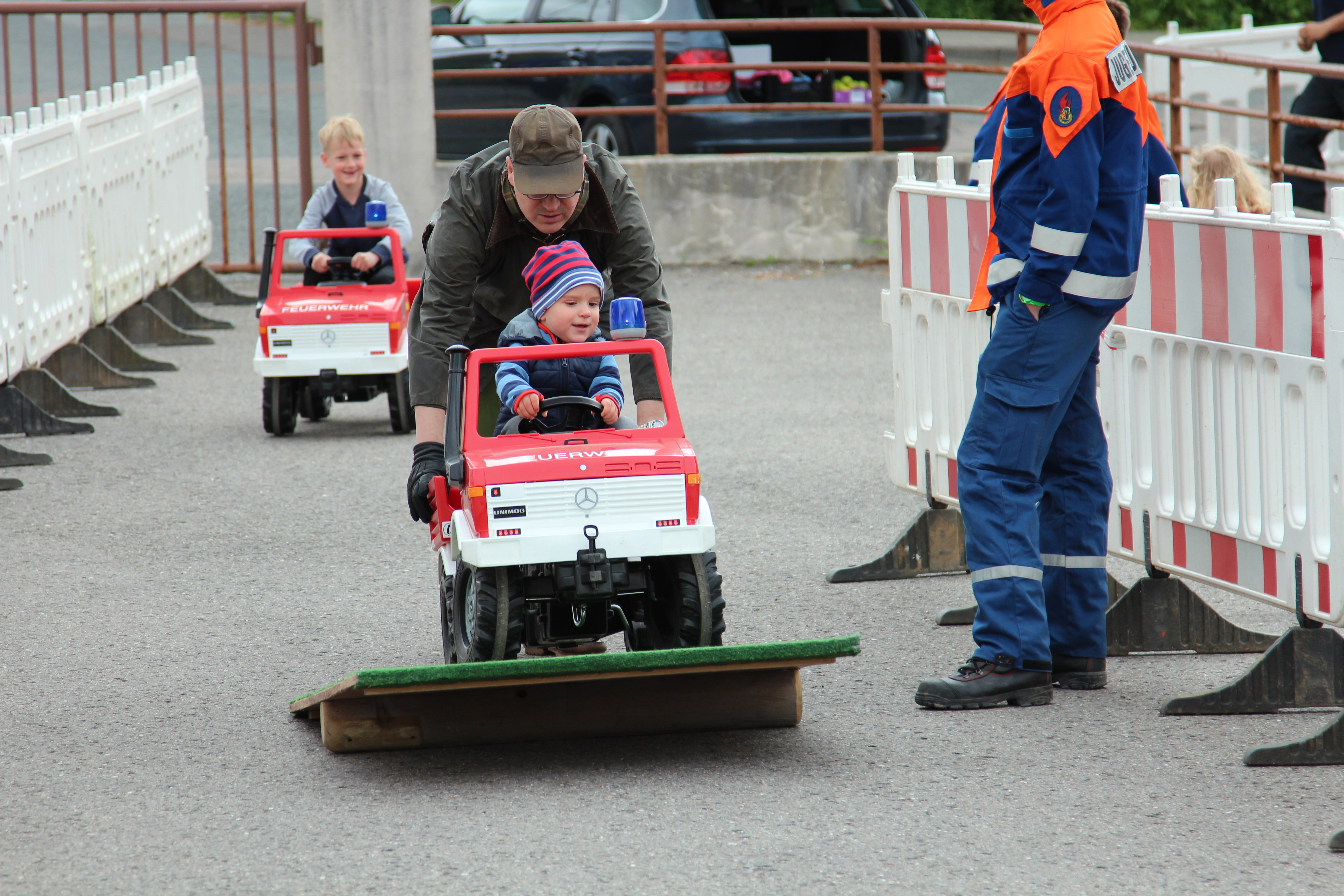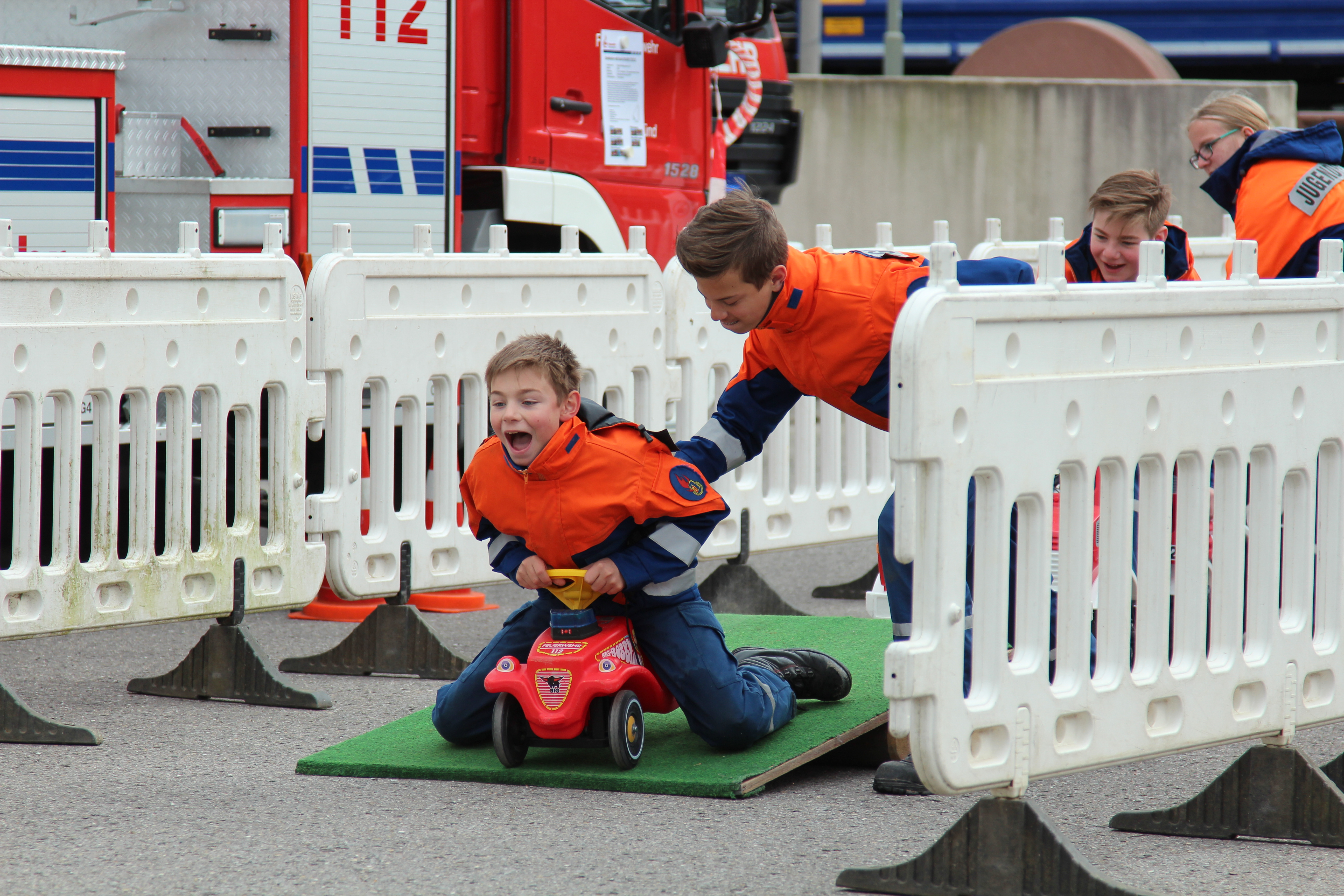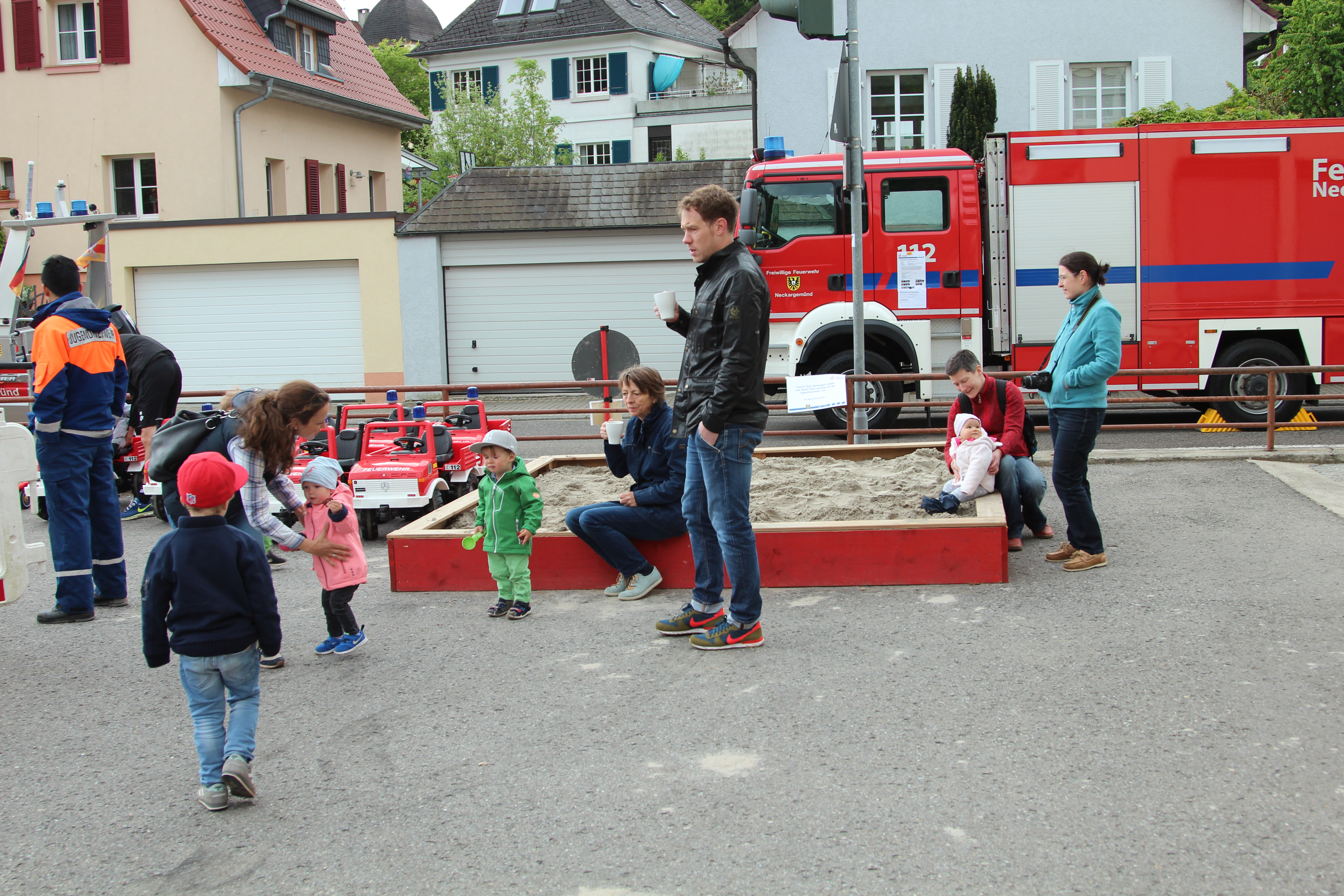 Für die Kleinen gab es wieder die beliebte Hindernisstrecke, welche mit kleinen Unimogs und Bobby Cars überwunden werden musste, den großen Sandkasten, in dem nach kleinen Schätzen gegraben, eine Wasserspielstation, an der die ersten Löschversuche gemacht und eine Bastelecke, in welcher Schlüsselanhänger aus alten Schläuchen gebastelt werden konnten.