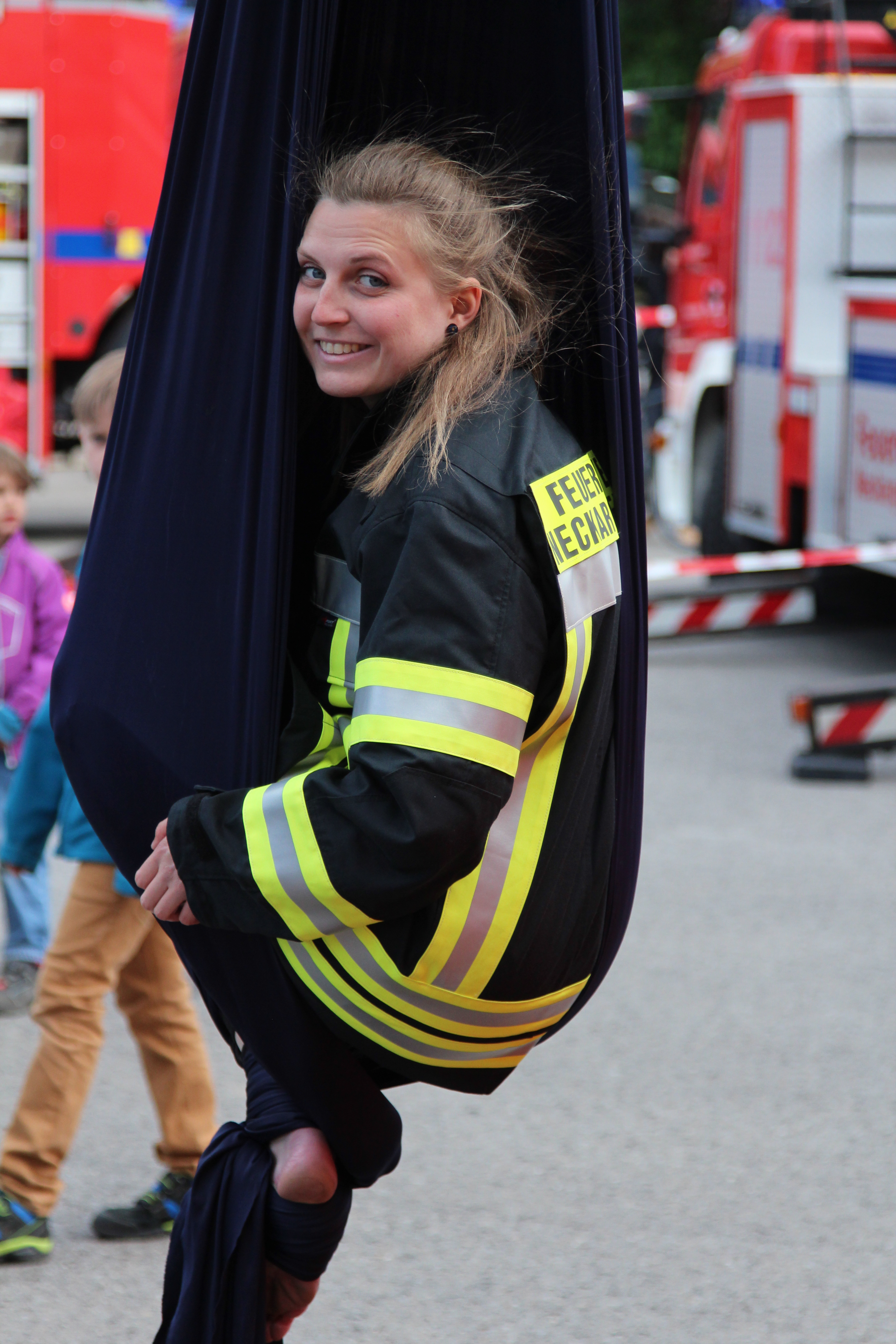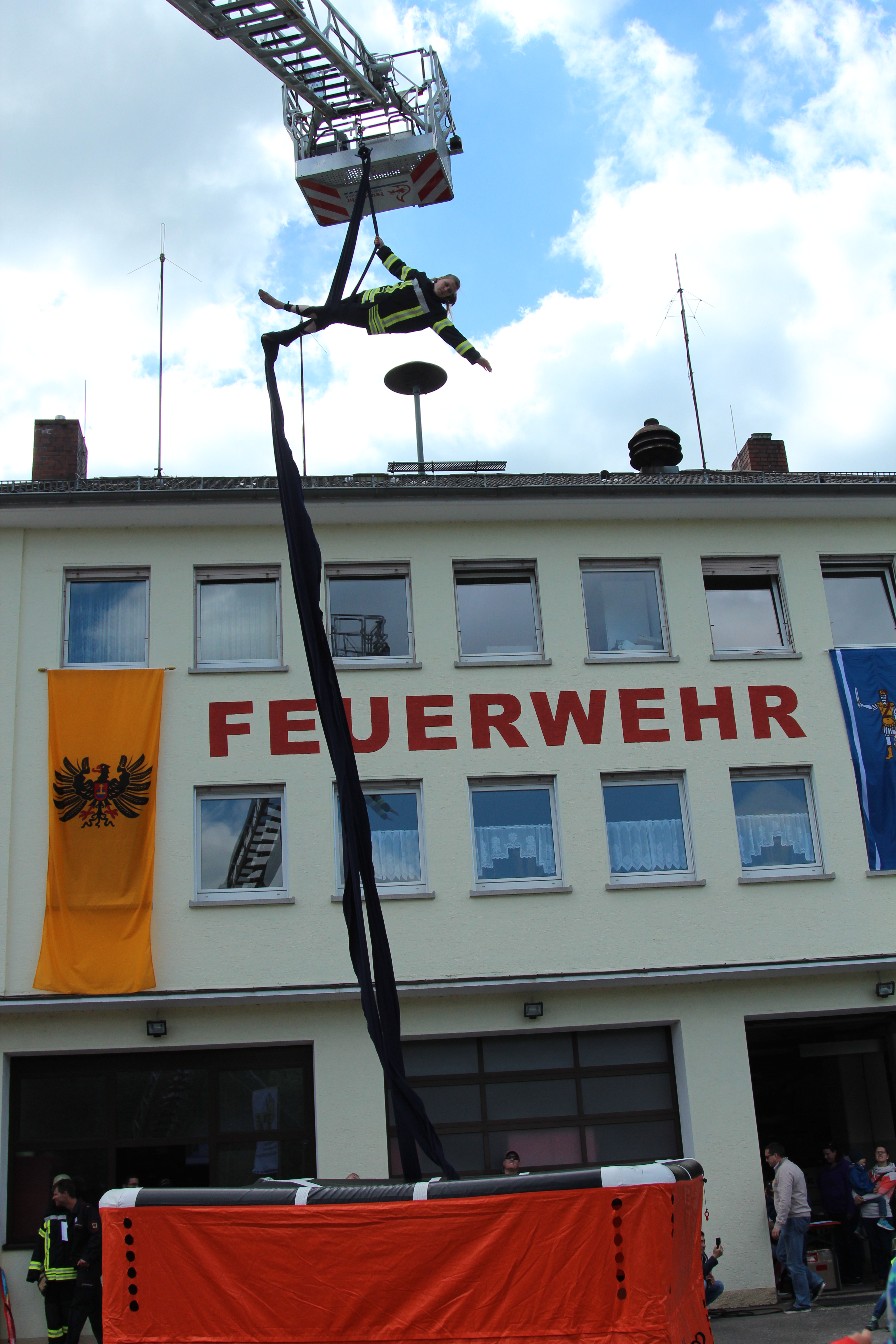 Als Highlight gab es in diesem Jahr eine Premiere. Neben der feuerwehrspezifischen Vorführung, dieses Jahr die Unfallrettung aus einem PKW, wurde den Zuschauern spannende Höhenakrobatik gezeigt. Anika, leidenschaftliche Kletterin und Vertikaltuch-Akrobatin, zeigte an der Drehleiter in bis zu 13 m Höhe ihr Können am Vertikaltuch. Mit Szenenapplaus zeigten die Besucher ihre Begeisterung. Auch die Fahrzeugausstellung durfte in diesem Jahr nicht fehlen. Gerade bei den Kids kam das neue Mehrzweckboot sehr gut an.
