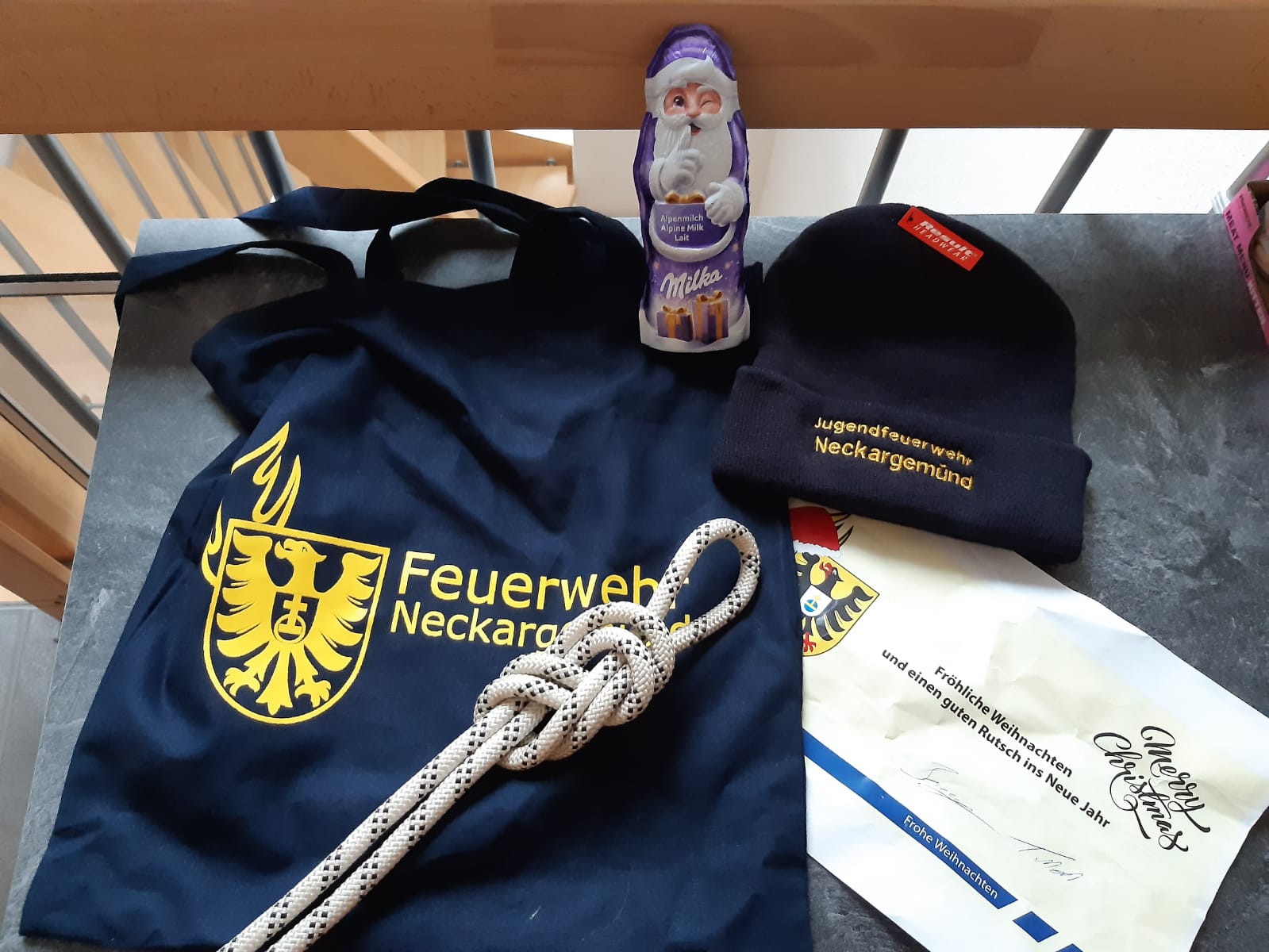 Am Mittwoch, den 23. Dezember war die Jugendleitung unter Berücksichtigung aller geltenden Hygienebestimmungen in den Stadtteilen Neckargemünd und Kleingemünd unterwegs und verteilte Taschen an die Nachwuchsretter. Darin fanden sich neben Süßigkeiten auch eine Mütze der Jugendfeuerwehr und ein Seilstück zum Üben feuerwehrtechnischer Knoten.